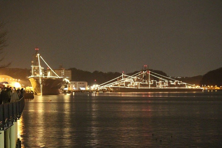 こんばんは。西郷宗範です。横須賀本港から望む景色とオレンジ色に染まるヴェルニー公園の夜景…