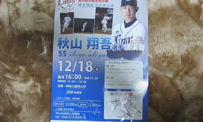 告知が遅くなりましたが、明日12月18日(日)16時から神奈川歯科大学において、埼玉西武ライオンズの秋山翔吾選手講演会が開催されます。