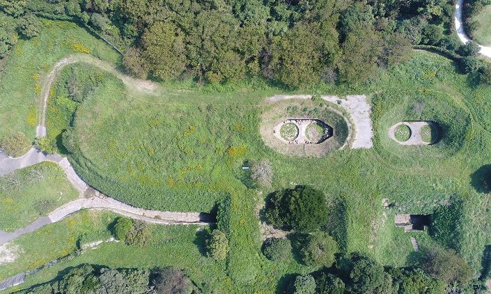 市側の千代ケ崎砲台と民間果樹園側の全体が上空からの撮影でよくわかります。