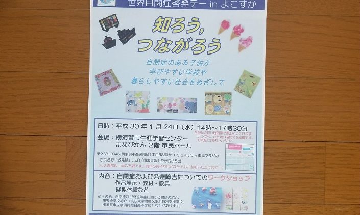 明日1月24日(水)14時から17時30分まで横須賀市生涯学習センターまなびかん2階市民ホールにおいて「世界自閉症啓発デーinよこすか」が開催されます。