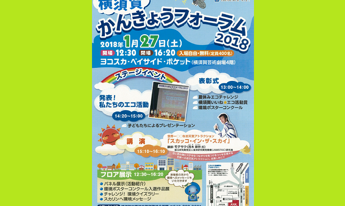 1月27 日(土)13時から16時20分までヨコスカ・ベイサイド・ポケットにおいて「横須賀かんきょうフォーラム2018」が開催されます。