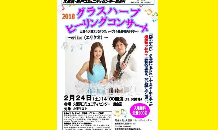 明日2月24日(土)14時から15時まで久里浜コミュニティセンターにおいて 2018グラスハープ ヒーリングコンサート が開催されます。