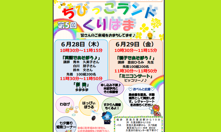 明日6月28日(木)、29日(金)の二日間、久里浜コミュニティセンターにおいて第5回ちびっこランドくりはまが開催されます。