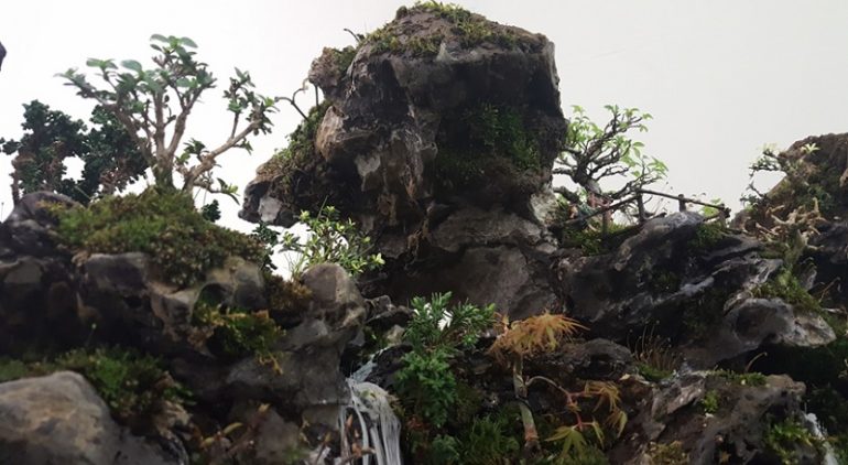 写真の盆景も作品の一部分を写してみると、まるで渓谷にいるかのよう…