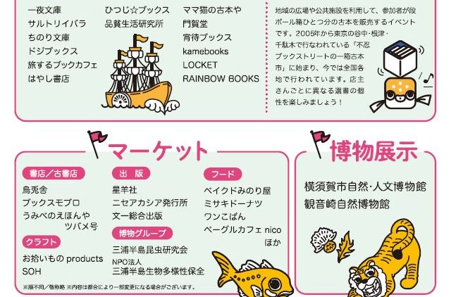 一箱古本市や、書籍、クラフト、飲食のお店のほか、博物展示やブックトークも行われます。