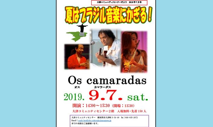 9月7日(土)14時から15時30分まで大津コミュニティセンター2階体育室においてサマーコンサート「夏はブラジル音楽にかぎる」が開催されます。