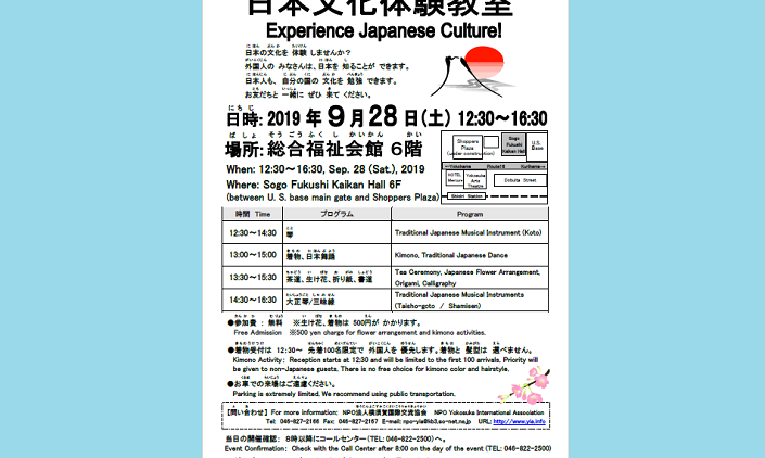 9月28日(土)12時30分から16時30分まで総合福祉会館6階本町コミュニティセンターにおいて日本文化体験教室が開催されます。