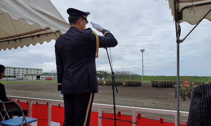 今年は雨量も少なかったせいか、グラウンドには水たまりはありませんでしたが、迷彩服での観閲となりました。
