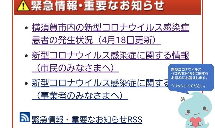 横須賀市ホームページトップ画面と新型コロナウイルス感染症情報のページで右下にスカリンがでます。