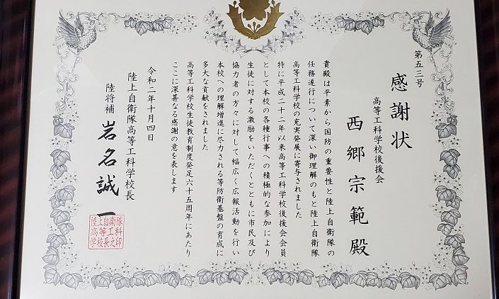 先日、陸上自衛隊高等工科学校から感謝状が贈られてきました。
