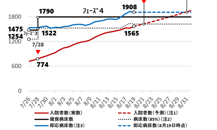 まだ余裕があるように見えるかもしれませんが、即応病床数は、医療機関の協力により、病床確保フェーズ4の最大確保病床数を超えた病床数を確保してもらっている状況です。