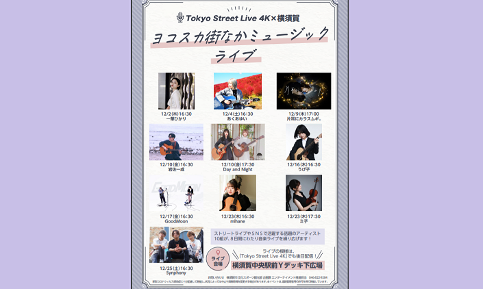 ストリートライブやSNSを中心に活躍する話題の若手アーティスト10組が、8日間にわたり横須賀中央駅前で音楽ライブを繰り広げ、Xmasシーズンの街を盛り上げます。