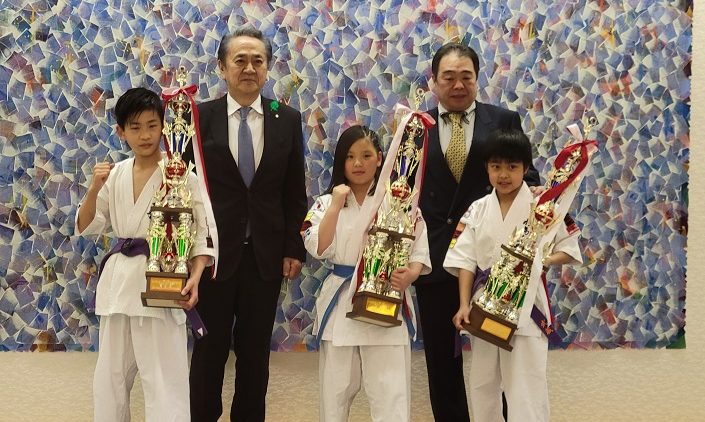 空手道の大会で優秀な成績を収めた3選手と市長表敬