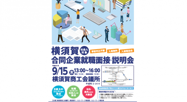 9月15日(木)13時から16時まで横須賀商工会議所において社会人対象の「横須賀合同企業就職面接・説明会」が開催されます。