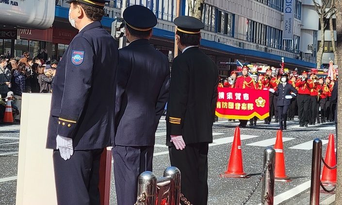 さて、パレードは消防団音楽隊のマーチングに始まり、女性消防団の行進、消防団車両のパレード、消防局車両、米海軍横須賀基地消防隊車両のパレードへと続きます。