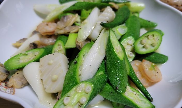 ねばねばオクラ、オクラの肉巻き、オクラの海鮮炒め、オクラと山芋の浅漬けなど、ふんだんにオクラを使った料理を作りました。