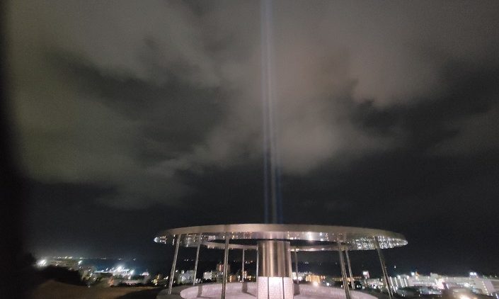 平和モニュメント照射が行われ、高校生スピーチ「私が思う半径10メートルの平和」や詩の朗読、高校生による合唱、市内小学生鈴木莉愛さんによる独唱が行われます。