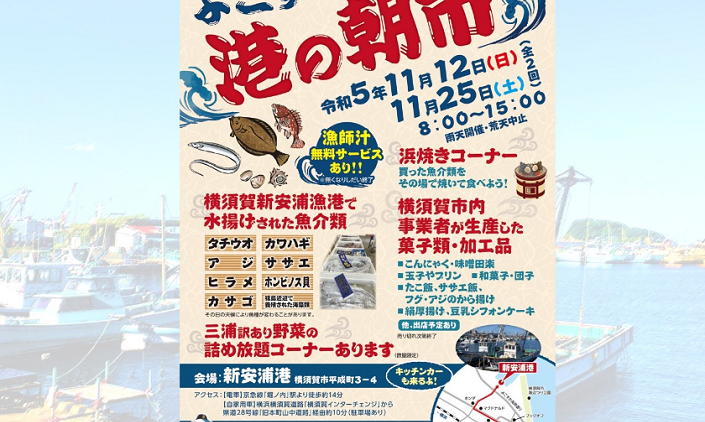 明日11月25日(土)8時から15時まで新安浦港においてよこすか港の朝市が開催されます。