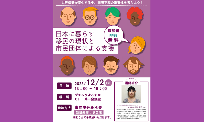 12月2日(土)14時から16時までヴェルクよこすか6階第一会議室において市民平和のつどい「日本に暮らす移民の現状と市民団体による支援」が開催されます。