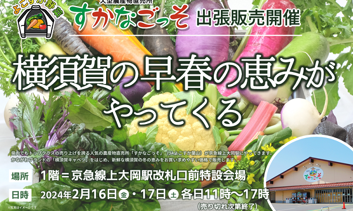 2月16日(金)及び17日(土)の2日間限定で、京急線で3番目の乗降客数を誇る「上大岡駅」にて、JAよこすか葉山農産物直売所「すかなごっそ」が出張販売を行います。