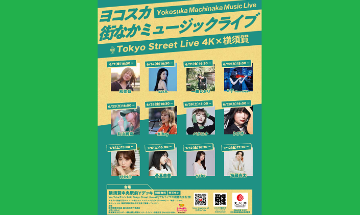 街なかミュージックライブは、SNS等で注目の若手アーティストのライブ映像を配信するYouTubeチャンネル「Tokyo Street Live 4K」(登録者数30万人超)プロデュースによるもので、ライブの模様は、YouTubeチャンネル「Tokyo Street Live 4K」で生配信し、横須賀の中心地から音楽で街なかを活気づけます。