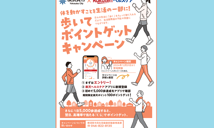 横須賀市と包括連携協定を締結している楽天グループ株式会社の「楽天ヘルスケア」アプリを活用した「歩いてポイントゲットキャンペーン」を実施することとなりました。