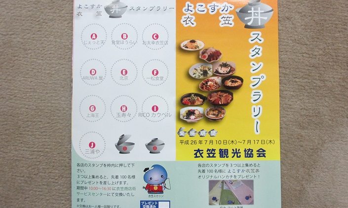 なお、スタンプラリーのパンフレットはJR衣笠駅、京急主要駅の横須賀市専用ラック、京急バス衣笠営業所、衣笠行政センター、池上市民プラザ、はまゆう会館、横須賀市役所商業観光課、衣笠商店街広報ラック、衣笠商店街サービスセンター、よこすか衣笠丼参加各店、YYポート横須賀などでもらえます。