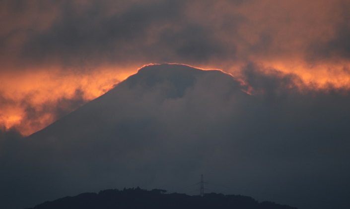 富士山にも雲がかかっているようですが、オレンジ色にかたどられた富士山がくっきりと頭を出しました。