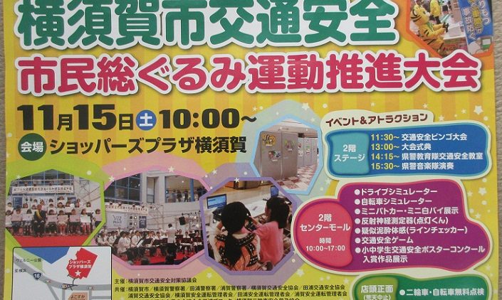 11月15日(土)10時から17時にショッパーズプラザ横須賀2階において横須賀市交通安全市民総ぐるみ運動推進大会が開催されます。