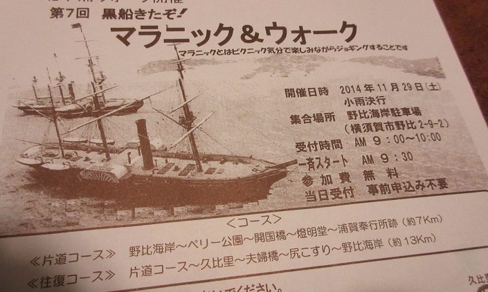 もともとは、「黒船がきたぞー」と、ペリー来航時、野比在住の人がいち早く発見し浦賀奉行所に駆け込み知らせた史実から野比海岸から浦賀奉行所までのコースを歩くというものです。