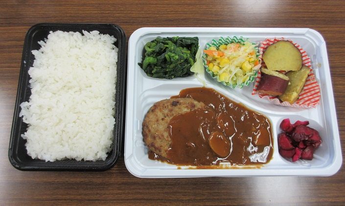 きょうのメニューは、ごはん並盛、ハンバーグデミグラスソース、サツマイモの甘煮、コールスローサラダ、おひたし、漬物です。