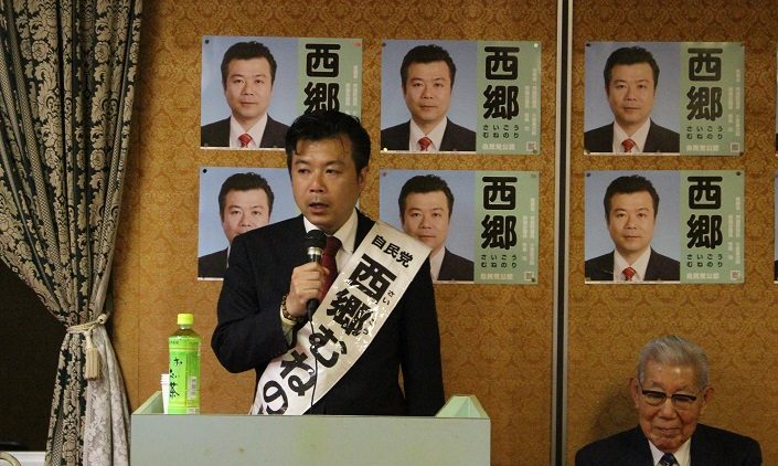 後援会長のあいさつに続き、先日の県議会議員選挙でトップ当選を果たした牧島功県議会議員の応援演説…