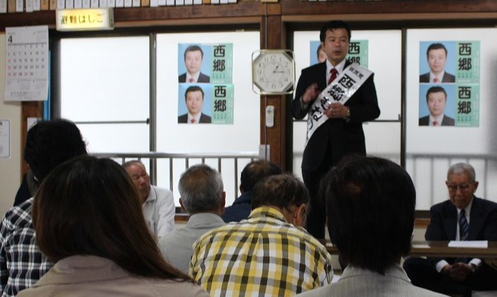 前回も行っていますが、夜だと足元が不安で出歩けないという方のために少しでも多く演説を聞いていただきたいという事から、町内会館での開催…