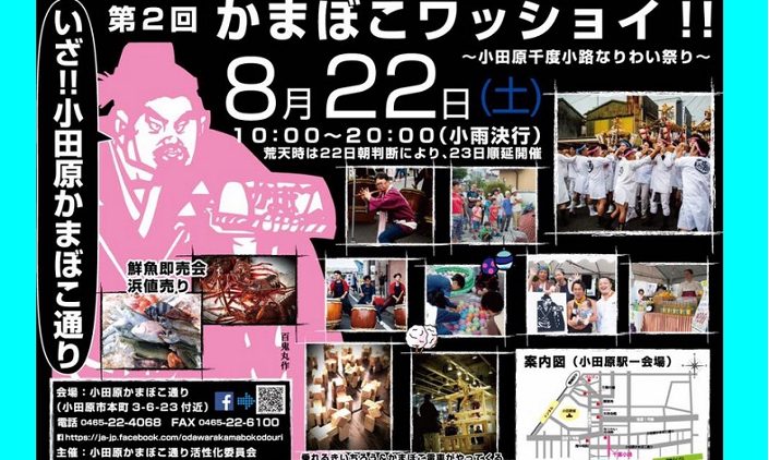 8月22日(土)10時から20時に小田原の名物「蒲鉾」を生産・販売する老舗が並ぶ本町から浜町の旧街道沿い(通称:かまぼこ通り)において「第2回かまぼこワッショイ!」が開催されます。