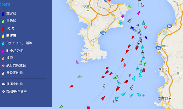 ちょうど今頃はアイキャッチ画像のように浦賀水道を東京湾に向かって進行中ですね。