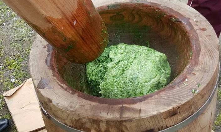 まずはもち米をつぶしながらヨモギを混ぜていくのですが、これが意外と一苦労です。