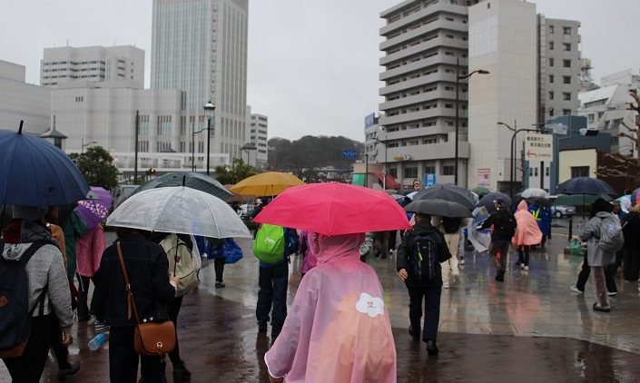 スタート直後は皆さん傘などを持ち、足場を確認しながら歩くためペースは遅めでしたが、横断歩道を超えると皆さん徐々にペースが上がり、私は後方…