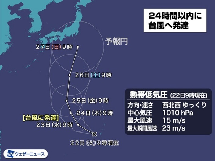 こんばんは。西郷宗範です。先ほど、マリアナ諸島の熱帯低気圧が24時間以内に台風5号へ変わ…
