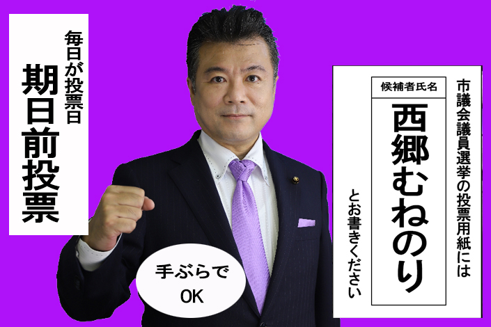 こんばんは。西郷宗範です。昨日から横須賀市長選挙が始まりましたが、きょうから期日前投票が…