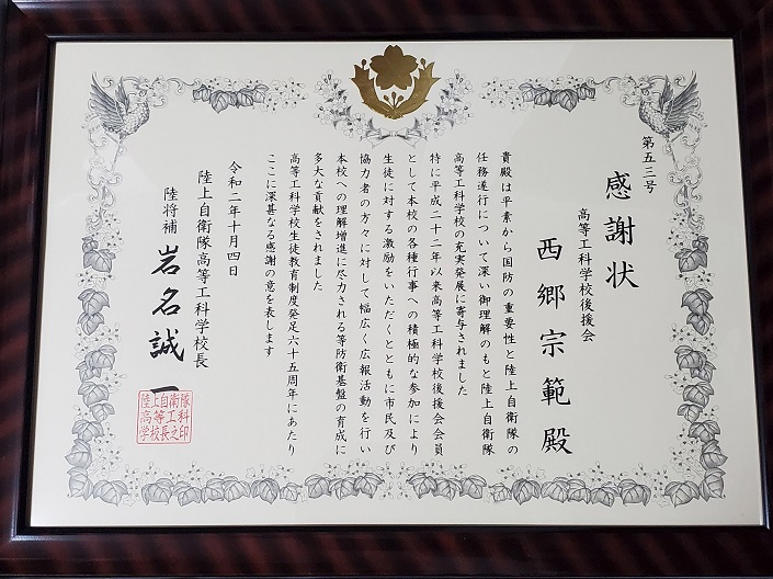 こんばんは。西郷宗範です。先日、陸上自衛隊高等工科学校から感謝状が贈られてきました。通常…