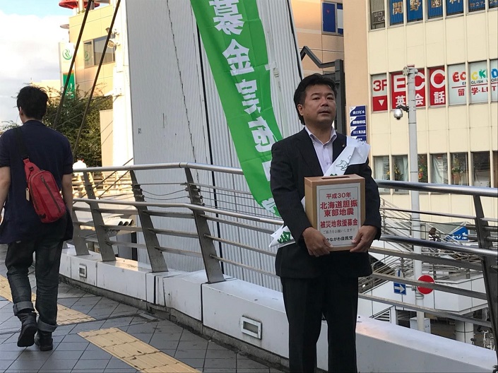 こんばんは。西郷宗範です。 きょうは横須賀中央駅前において北海道胆振東部地震被災地救…