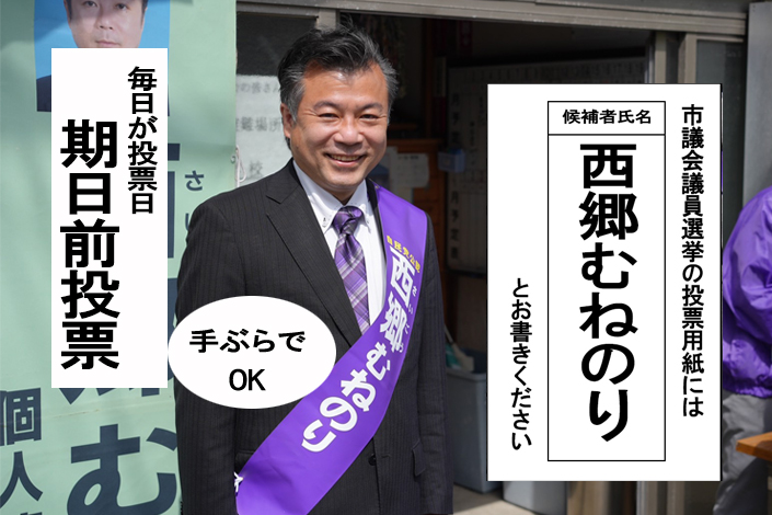 こんばんは。西郷宗範です。市議会議員選挙も3日目を間もなく終えようとしています。横須賀中…